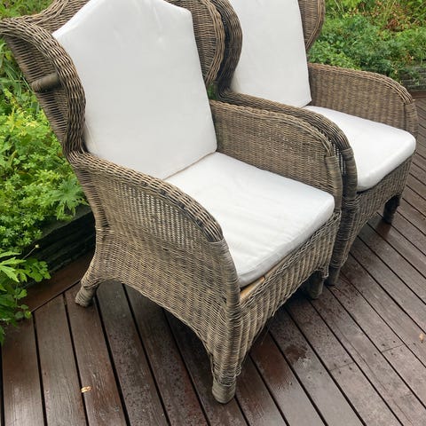 Myydään tarpeettomana 2 rottinkituolia. Toisen alaosa hieman kärsinyt, muuten hyvässä kunnossa. Säilytetty kesällä katoksen alla, talvisin sisätiloissa. Tummanharmaat pehmusteet tulee mukaan.