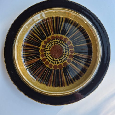 Setti Arabian klassista Kosmos-sarjaa 60-luvulta (valmistusleima 12/1966) Halkaisija 17,5cm. Korkeus 3cm. Suunnitelleet Gunvor Olin-Grönqvist (koriste) ja Ulla Procopé. Malli: Kosmos