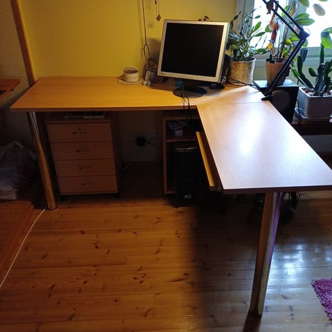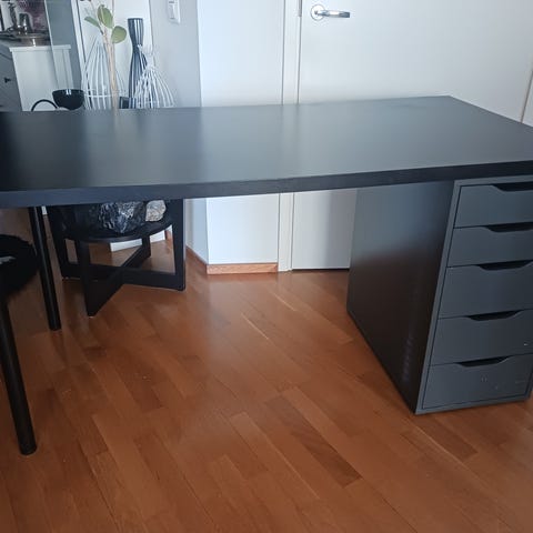 Myydään kuvan mukainen hyväkuntoinen Iskun työpöytä. Pöytätaso on irrallinen, sen leveys on 150 cm, syvyys 53 cm ja korkeus 73 cm. Pelkän laatikoston leveys on 90 cm, syvyys 47 cm ja korkeus 64 cm.
