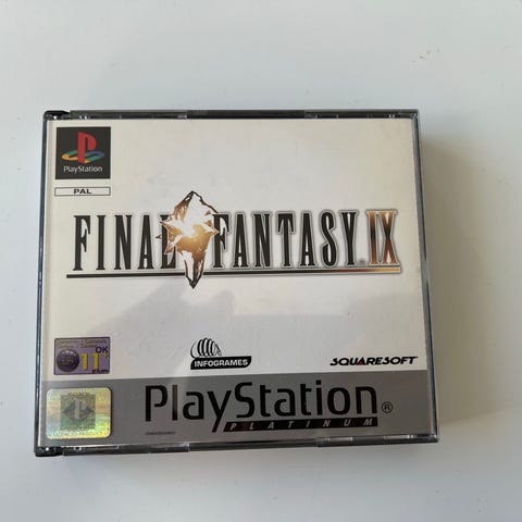 SquareSoft Final Fantasy IX PlayStation peli. Roolipeli alkuperäisessä PlayStation-formaatissa usealla levyllä. Pelikotelo ja levyt näkyvät kuvissa. Soveltuu pelattavaksi PlayStation-konsolilla, joka tukee alkuperäisiä PS1-pelejä.