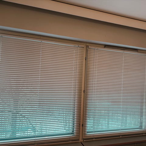 Molemmista valkoisista sälekaihtimista on "tikku" hävinnyt. Lisäksi toisen valkoisen sälekaihtimen yksi säle hieman vääntynyt(kuvassa).