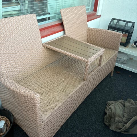 Harmaa polyrottinkinen paripenkki, jossa kaksi istuinpaikkaa ja keskellä kiinteä lasikannellinen pöytätaso. Sopii parvekkeelle tai terassille ulkokäyttöön. Selkänojat ovat korkeat ja istuimissa on irralliset istuintyynyt. Runko on valmistettu säänkestävästä materiaalista, joka on helppo puhdistaa kostealla liinalla. Pöytätaso tarjoaa paikan juomille ja pienille esineille.