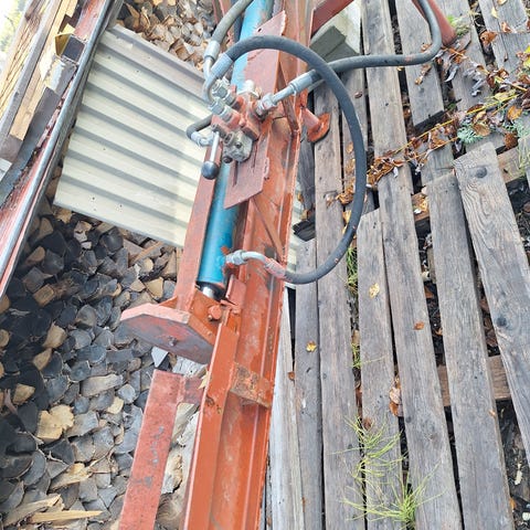 Traktorin hydrauliikalla 12 tonnin puristus voimalla toimiva halkomakone. Iskun pituus noin 1,1 metriä.