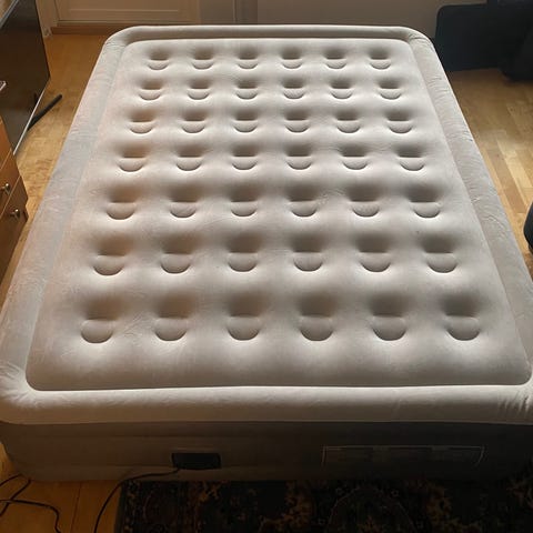 Ilmapatja, jossa on sisäänrakennettu pumppu joka toimii normaalilla pistokkeella. Mukana kantokassi, jossa Asaklitt-logo. Leveysmitta arvio (ei täytetty testissä).Hyvässä kunnossa ilman näkyviä vaurioita.