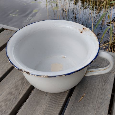 Potta on hyvässä kunnossa, mutta siinä on pieniä käytön jälkiä kahvassa.
