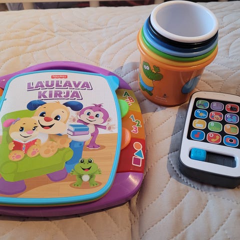 Leluja, ikean muovilautasia ja jotain muita, vaatteita( enemmän ja vähemmän käytettyjä), kirjoja, palapelejä, kylpytakki!!