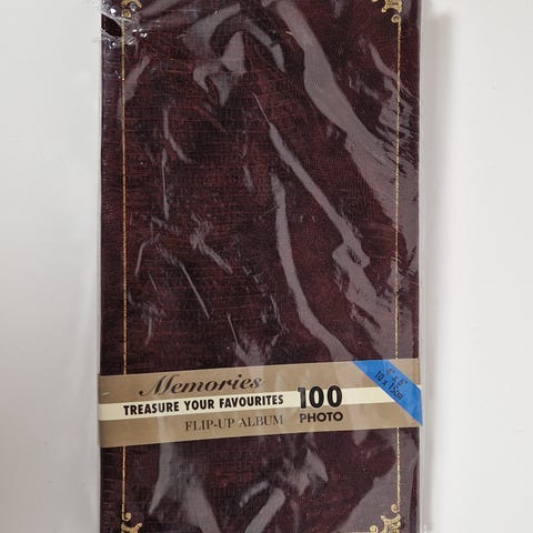 Vanha, käyttämätön, valokuvakansio. 15 sivua, joissa paikat 3 valokuvalle. Viillot kahdelle erikokoiselle kuvalle.