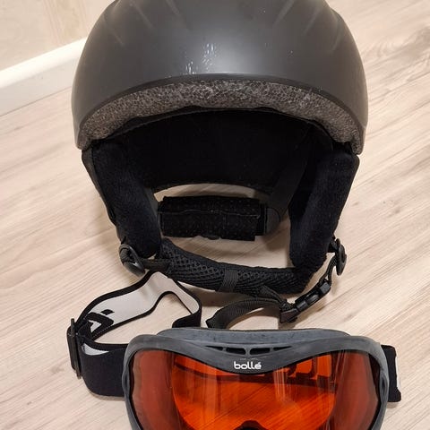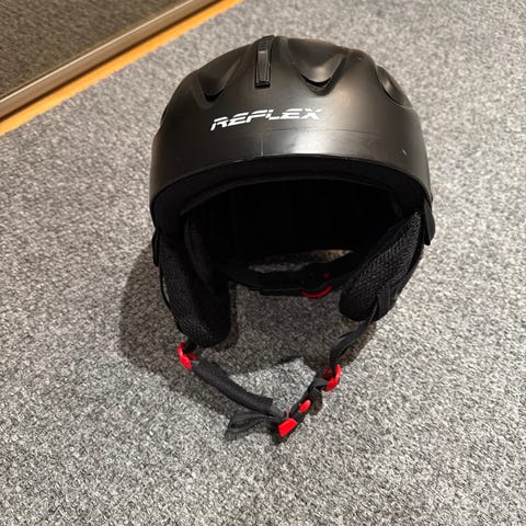 Reflex laskettelukypärä ja laskettelulasit. Kypärä on musta ja siinä on säädettävä leukahihna sekä pehmustetut korvaosat. Kypärän takaosassa on pidike laskettelulaseille. Laskettelulasit ovat tummasävyisellä linssillä ja valkoisilla kehyksillä. Sopii lasketteluun ja lumilautailuun.