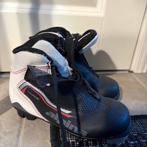 Alpina hiihtomonot, koko 32. Väri musta harmailla ja valkoisilla yksityiskohdilla. Nauhakiinnitys ja nilkkaa tukeva varsi. Päällinen tekstiiliä ja synteettistä materiaalia, vuori tekstiiliä ja pohja kumia.