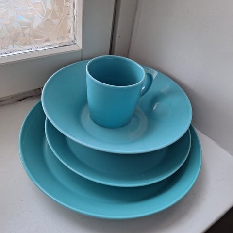 Kolme kappaletta Iittalan Teema -sarjan leipälautasia. Halkaisija 17,5 cm. Kaksi mustaa ja yksi tummansininen.