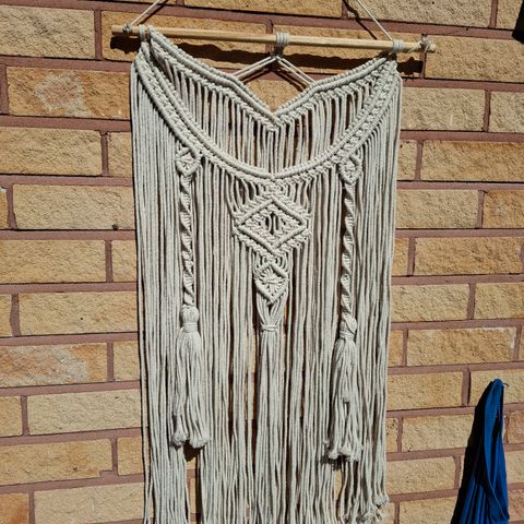 Punainen makrame, korkeus mukaanlukien ripustus 68cm ja leveys 28cm. Käyttämätön