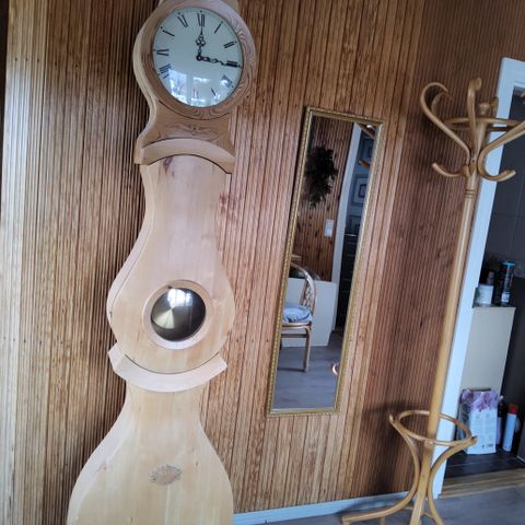 Mäntypuusta tehty kaappikello, jossa sivulla vitriinihyllyt ja ovet ja valaistus sisällä. Takaseinä leveys 100 cm, syvyys 35cm ja korkeus 205 cm. Koneisto jo itsessään usemman sadan euron arvoinen. Näitä ei tule vastaan on melkoisen uniikki käsityön taidonnäyte.