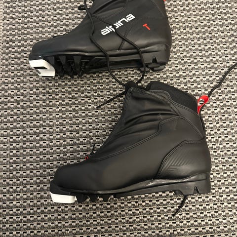 Alpina hiihtomonot, koko 41. Pohjan sisämitta noin 25cm. Väri musta valkoisilla yksityiskohdilla ja punaisilla nauhoilla. Päällinen synteettistä materiaalia, vuori tekstiiliä ja pohja kumia. Monoissa vetoketjukiinnitys ja nauhat, jotka suojaavat jalkaa ja tukevat nilkkaa. Sopivat perinteisen tyylin maastohiihtoon NNN-siteisiin.