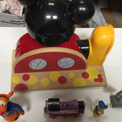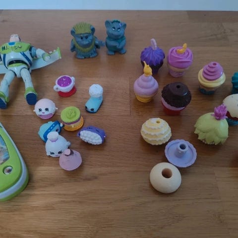 Linnotuksia ja erilaisia ukkeleita ym. mitä kuvassa näkyy.