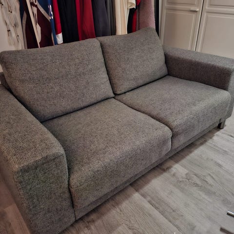 Hyväkuntoinen sohva, josta saa 140 cm leveän vuoteen. Vuoteessa sälepohja.