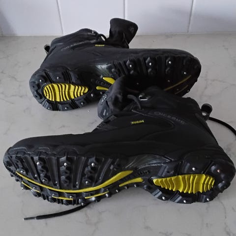 Ei repeämiä, vaurioita tai merkittäviä kulumajälkiä. Nastat ja pohjat erinomaisessa kunnossa. BUGrip-pohjat tarjoavat loistavan pidon jäällä ja lumella.