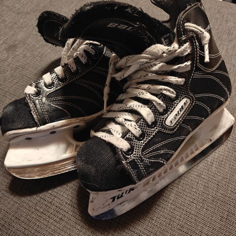 Bauer jääkiekkoluistimet lapsille, koko 35. Väri musta valkoisilla teräpitimillä ja punaisilla yksityiskohdilla. Iissä, Illinsaaressa.