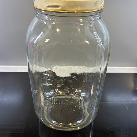Ehjä Riihimäen lasin tölkki , jossa mukana kansi. Kansi ei pysy oikein kiinni jengoillaan, mutta ehkä taivottulemalla saisi taas kuntoon.