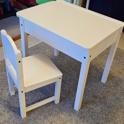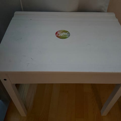 IKEA lasten pöytä säilytystilalla, väri valkoinen. Pöydän kansi on saranoitu ja sen alta löytyy säilytystila esimerkiksi piirustus- ja askartelutarvikkeille. Materiaali on puuta tai puupohjaista levyä. Soveltuu lapsen työ- ja leikkipöydäksi esimerkiksi piirtämiseen, askarteluun ja leikkeihin. Pöydän pinnassa on käytön jälkiä ja kulumaa, mikä näkyy kuvissa. Myös sisäpuolella jonkin verran kynän jälkiä. Mekanismit ehjät ja pöydän voi helposti hioa tai maalata jos haluaa.