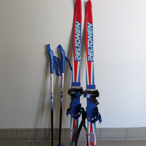 Peltonen maastohiihtosukset siteillä. Suksissa on siteet asennettuna. Mukana maastohiihtosauvat hihnoilla.