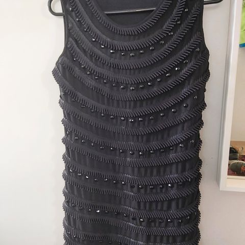 Mekossa on hopeansävyinen etuosa koristeellisella, jalokivi- ja helmikuvioita muistuttavalla printillä sekä muutamilla helmi/”jalokivillä”. Selkäpuolella on kuviollista, hieman läpikuultavaa neulosta, jossa on geometrisia reikäkuvioita ja alla erillinen vuorikerros. Hihaton malli, pyöreä pääntie.