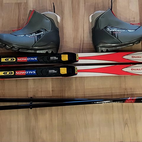 Käytetyt mutta uudenkarheat Salomon sukset, monot ja Karhun sauvat.