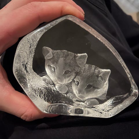Lasinen koriste-esine, jossa on kissa-aiheinen kohokuviointi. Esine on kirkasta lasia ja muodoltaan epäsymmetrinen, sopii esimerkiksi pieneen sisustuskoristeeseen tai paperipainoksi. Koriste voidaan sijoittaa tasaiselle pinnalle, kuten hyllylle, pöydälle tai ikkunalaudalle.