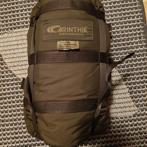 Tähän saa mukaan telttakaaren 30€ lisähinnasta. Alkuperäinen kompressiopussi ei kuulu kauppaan syystä että heitetty pois ja tilalle tuli paljon käytännöllisempi rip-stop -kankainen 5 litran pussi, jonne huomattavasti helpompi sulloa. Sullottu pussi viimeisessä kuvassa.