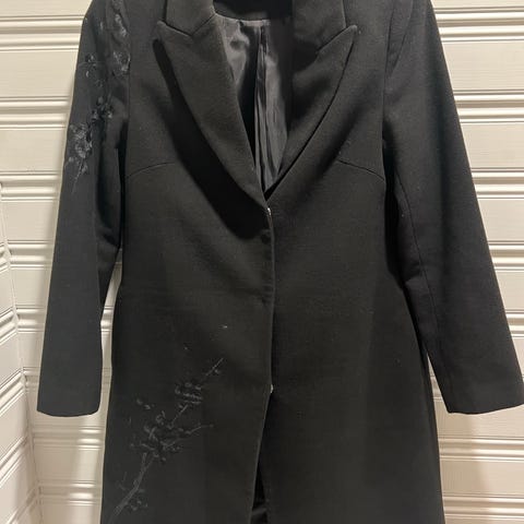 H&M pitkä naisten takki. Koko XS (EU). Väri musta. Materiaali tekoturkista, sisäpuolella sileä vuori. Malli on polvipituinen tai hieman sen yli, pitkät hihat. Sopii viileämpiin säihin ja kerrospukeutumiseen.