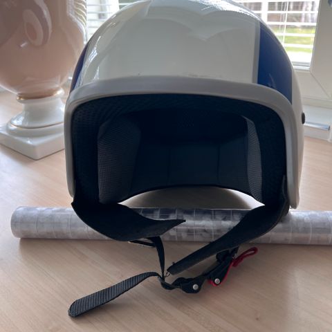 Vespa avokypärä punaisella kuorella ja mustalla alaosalla. Kypärässä on leukahihna pikasoljella ja sisäpehmusteet. Sopii esimerkiksi skootterikäyttöön. Koko- ja materiaalitiedot näkyvät valmistajan merkinnöissä kypärän sisäpuolella.