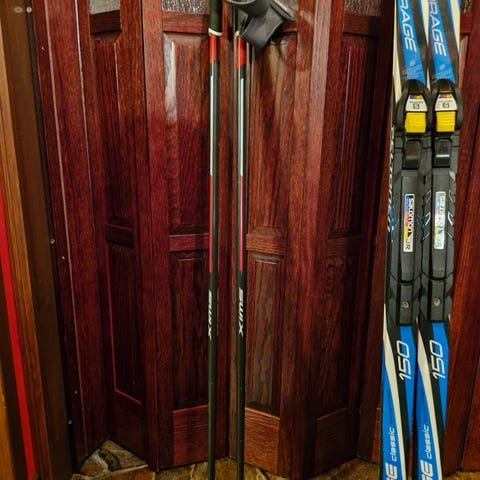 Hyväkuntoiset lasten 100 cm sukset ja sauvat. Suksissa remmisiteet.