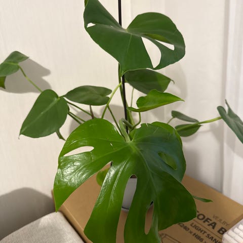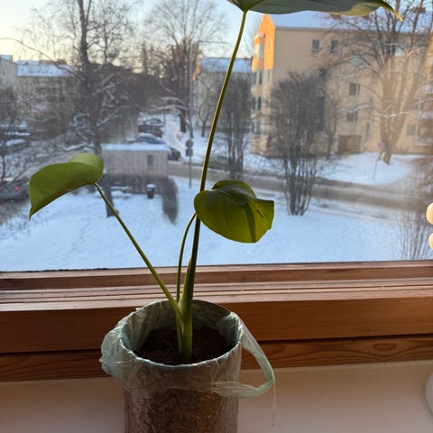 Monstera viherkasvi muovisessa kasvatusruukussa. Kasvilla on useita pitkiä versoja ja vihreitä, osittain reikiintyneitä lehtiä. Sopii huonekasviksi sisätiloihin. Kasvi myydään kuvien mukaisessa kunnossa ilman suojaruukkua.