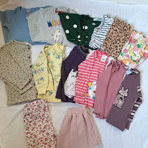 Vaatepakettiin sisältyy t-paitoja, pitkähihaisia, housuja, shortseja, uimashortsit, huppari, collegepaita, Disney Cars aamutakki, aurinkolasit, pimeässä kiiltävät luuranko asut, Reima villapipo, Mini Rodini sekä Me&I välikausihatut ym.