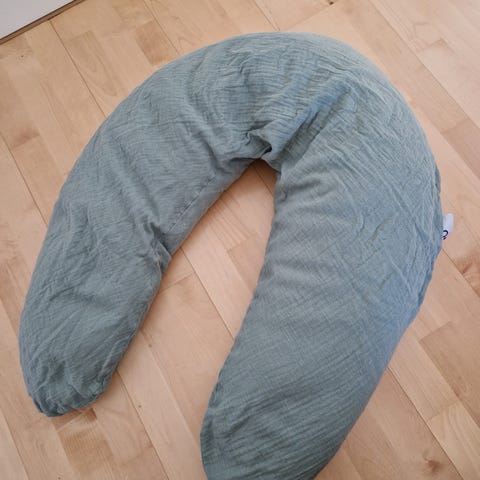 Myydään iso C-muotoiltu raskaustyyny / vartalotyyny/ body pillow. Merkki Motherhood, malli Classic. Tässä mallissa yksi pääty taittuu näppärästi, jolloin mukavampi nukkua sen kanssa tai taittaa imetyksen tueksi. Alaosa leveämpi, jotta tukee riittävästi lantiota ja keskivartaloa. Ison koon ja ergonomisen muotoilun ansiosta tukee vartaloa kauttaaltaan. Irrotettava ja pesty 100% puuvilla päällinen, harmaa kuviointi. Täyte vanua eli ei vaaraa että muhkeus kärsii (kuten esim. Imetys- tai raskaustyynyissä joissa rakeita sisällä). Kunto: siisti käytetty kunto. Tarkastelussa yksi selkeämpi kuluma vetoketjua ympäröivän kankaan alaosassa, dokumentoitu kuviin. Pesty hajusteettomalla pesuaineella ja tyyny tampattu ja tuuletettu kunnolla pakkasessa eli valmiina käyttöön seuraavalle nukkujalle. Meillä lemmikitön ja hajusteeton koti, ei tupakointia.