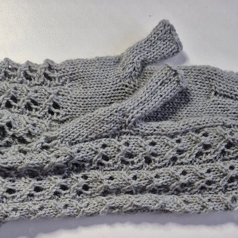 Käsineet melkein kuin lapaset, lämmittää käsiä, mutta jättää sormenpäät vapaaksi. Käytä sormikkaiden kanssa tai ilman. Pitsi ranteesta lähtien koko matkan, sormien kohdalla lyhyt resori. Kämmenen sisäpuoli sileää neulosta. Peukalot neulottu noin kynteen saakka.