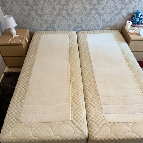 Annetaan jenkkisängyn ”välipatja”. Omaan makuun liian pehmeä. Edellisessä muutossa tullut kuljetuksessa tahraa. Koiratalous