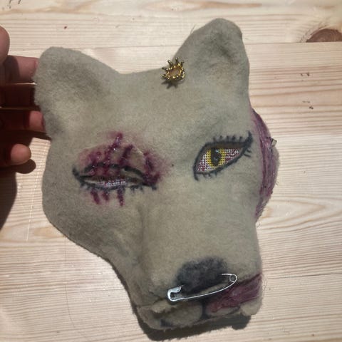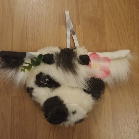 Therianmaski, jossa kissamainen kasvoaihe. Maski on valmistettu kankaasta ja pehmeästä, turkista muistuttavasta materiaalista. Etupuolella on maalatut kasvonpiirteet ja pitkät korvat, joissa on runsaat karvayksityiskohdat. Sivussa on koristeellinen höyhenriipus. Sisäpuoli on vuorattu kuviollisella kankaalla, ja maski kiinnitetään joustavalla nauhalla pään taakse. Sopii esimerkiksi naamiaisasuksi, roolileikkeihin tai rekvisiitaksi. Unisex-malli, joka soveltuu eri käyttäjille koosta riippuen naamariin mahtuvuuden mukaan.