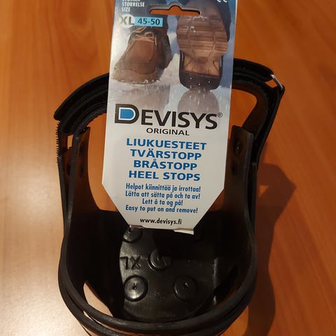 Liukuesteet kenkiin, koko L. Liukuesteet asetetaan kengän päälle parantamaan pitoa liukkaalla jäällä ja lumella. Materiaalina joustava kumimainen runko, jossa useita metallinastoja pohjassa. Soveltuu käytettäväksi ulkokävelyyn talviolosuhteissa. Näitä on kokeiltu kerran, muutama askel, mutta olivat omiin kenkiin liian löysät, ja siksi myyn. Seinäjoki, Pohja.