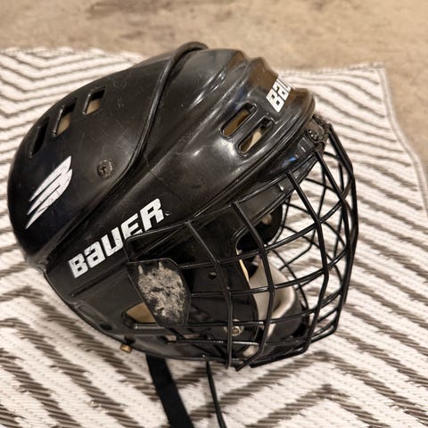 Eastonin jääkiekkokypärä, edessä halkeama näkyy kuvassa.