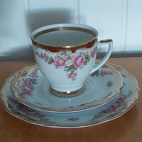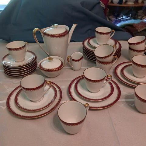 Myydään laadukas saksalainen Eschenbach (Bavaria-Germany) -kahviastiasto. Ajaton vaalea astia, jossa hillitty sininen kukkakoriste (streublumen-tyyppinen). Klassinen muoto, sopii hyvin arkeen ja juhlaan.