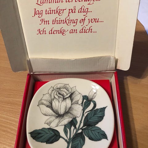 Esteri Tomulan suunnittelemat Arabian Rosa Baccara maljakko (14cm) 30€ ja seinälautanen (12,5cm) 30€.