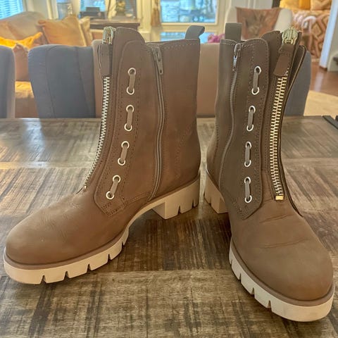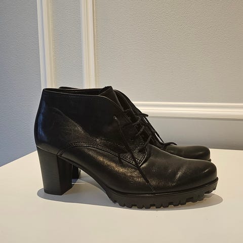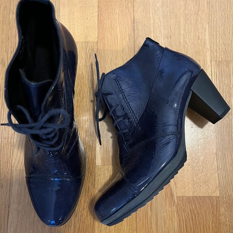 Koko 5,5 eli 38,5. Päällinen mokkanahkaa ja sisällä ohut vuori. Tosi siistit, kärjessä pieni tummentuma jota ei koitettu poistaa, näkyy kuvassa.