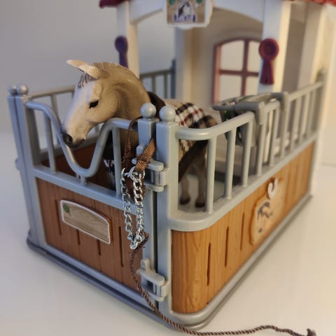 Schleich pikkutalli ja tarvikkeet. Hevonen yleisesti siisti, paikoitellen muutama pieni jälki. Mukaan mm. loimi, riimu, heinähäkki, omenat