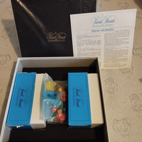 Testaa tietosi wanhalla Trivial Pursuit -pelillä, tämä suoraan kasarilta! Ajan patinaa on, mutta kaikki kysymyskortit, nappulat ym tallessa.