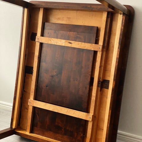 Pöytälevy priimakunnossa, jaloissa hieman tuolien hankauksesta aiheutunutta kulumaa.