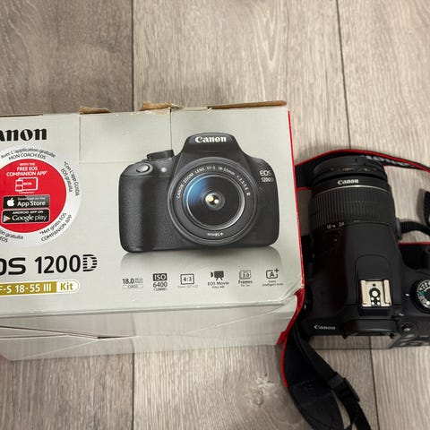 Canon EOS 1100D digitaalinen järjestelmäkamera, jossa vaihdettava objektiivi ja kaulahihna. Mukaan kaksi akkua ja laturi. Kamera toimii ongelmitta.