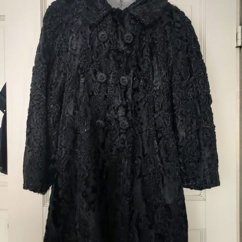 Upea, hyväkuntoinen krimiturkki, kauniilla, ehjällä kukkakuvioisella silkkivuorilla. Näyttävä, iso kaulus.