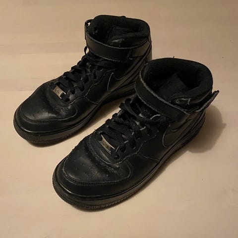 Nike Air Force 1 Mid -tennarit, mustat, koko 37,5. Kunto hyvä. Kärjen rei’issä osassa pieniä halkeamia. Vuoressa kantapään kohdalla pienet kulumat, niistä kuvat (viimeiset kuvat). Muutoin ei vikoja, tosi siistit.