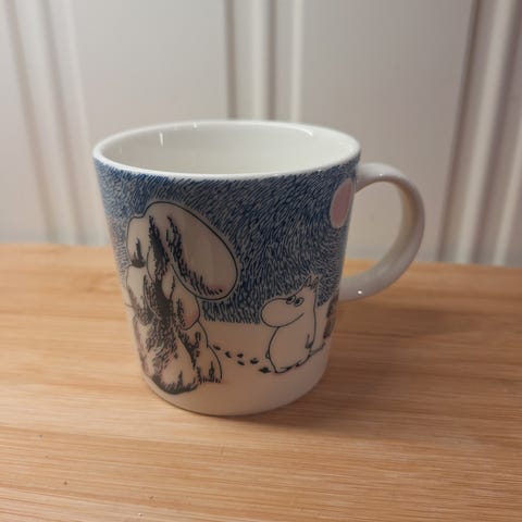 Arabia Muumipappa -muki, jossa tummansininen kuvitus Muumipapasta veneessä ja lyhdyn kanssa. Materiaalina keraaminen posliini. Muki soveltuu juomien tarjoiluun arkeen ja kahvihetkiin. Pohjassa teksti ”Moominpappa by Arabia”, muki on astianpesukoneen, mikroaaltouunin ja uunin kestävä valmistajan merkintöjen mukaan.