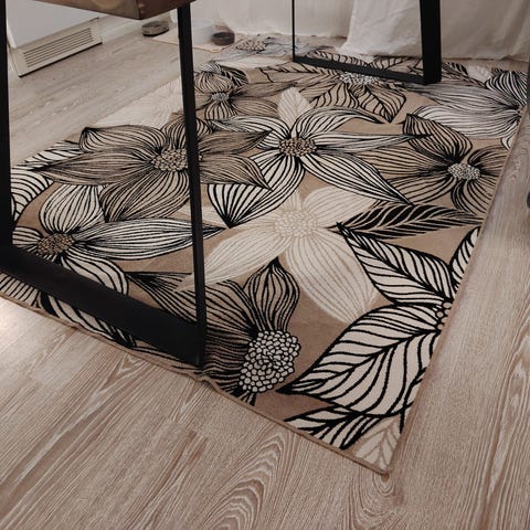 Kukallinen matto, jossa harmaalla pohjalla keltaisia ja vihertäviä kukkia sekä tummia oksakuvioita. Sopii esimerkiksi eteiseen, keittiöön tai pieneen tilaan sisustuselementiksi.